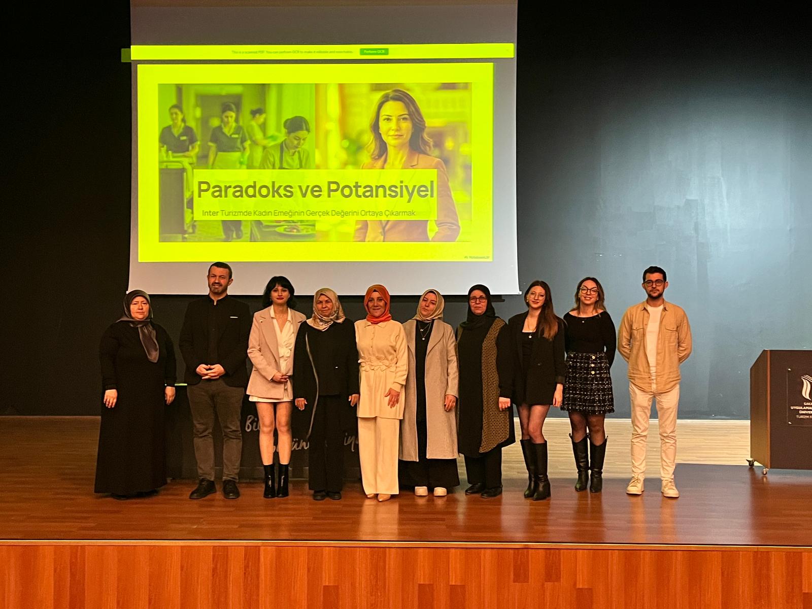 Etkinlik kapsamında, Karapürçek Eli Bereketli Kadın Girişimi Kooperatifi’nden Müzeyyen Uçar ve Aysel Keskin ile Söğütlü Kadın Girişimi Üretim ve İşletme Kooperatifi’nden Hülya Kolip, turizm öğrencileriyle bir araya gelerek sektörde edindikleri deneyimleri paylaştı. Konuşmacılar, turizm sektöründe kadınların karşılaştığı yapısal ve toplumsal sorunlara değinerek, istihdama erişim, karar alma süreçlerinde temsiliyet, finansmana ulaşma, iş–özel yaşam dengesi ve sektörde cinsiyet temelli önyargılar gibi konulara dikkat çekti.