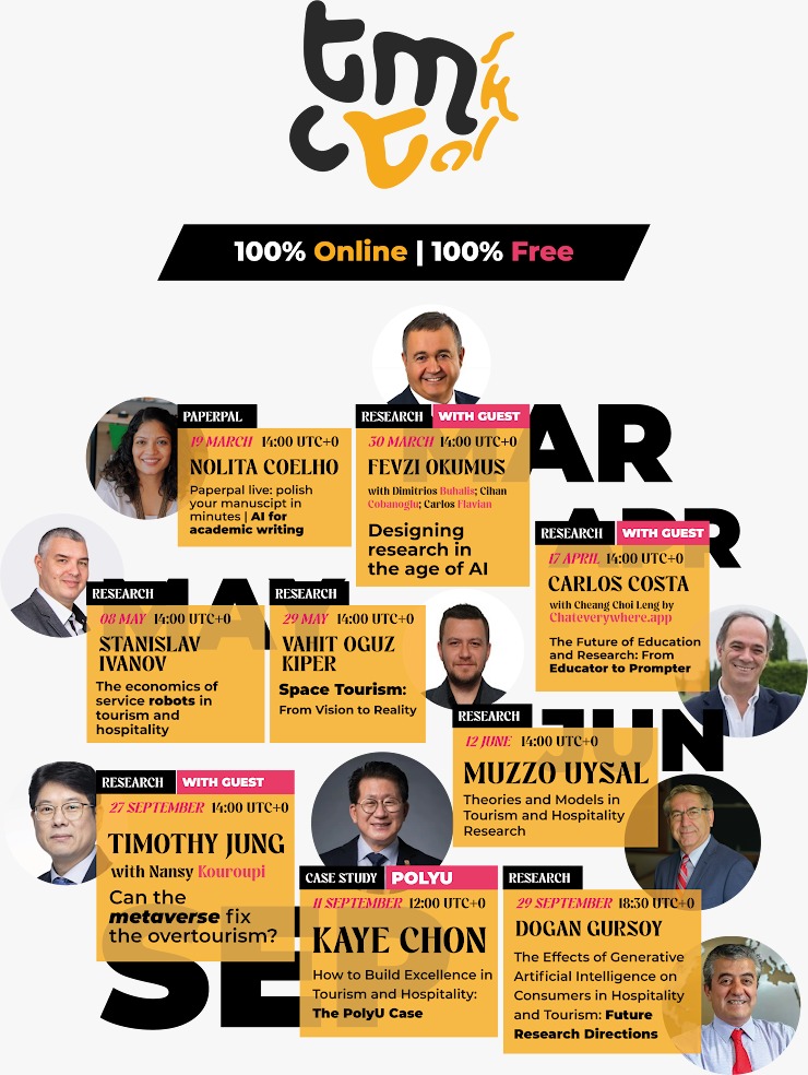 Tourism, Hospitality, and Computing Technologies (TMCT) konferansı öncesinde düzenlenen bu çevrimiçi seminer serisi, alanında dünyaca tanınmış araştırmacıları ve sektör liderlerini bir araya getiriyor. Topluluğu güncel tutmayı ve ilham vermeyi amaçlayan program; turizm, konaklama ve bilişim teknolojilerinin kesişim noktasındaki yüksek etkili araştırmalara odaklanıyor.
